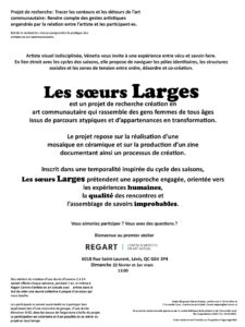 Du 1er mars 2026 au 30 avril 2027, Regart accueillera Les Sœurs larges, un projet de recherche universitaire portant sur l’art communautaire. Sous forme d’ateliers ouverts aux femmes et aux personnes s’identifiant comme femmes, cette recherche explorera la relation entre artiste et participantes aux ateliers. Au fil des semaines, les participantes contribueront à la réalisation d’une mosaïque en céramique ainsi qu’à la création d’un zine documentant le processus artistique.