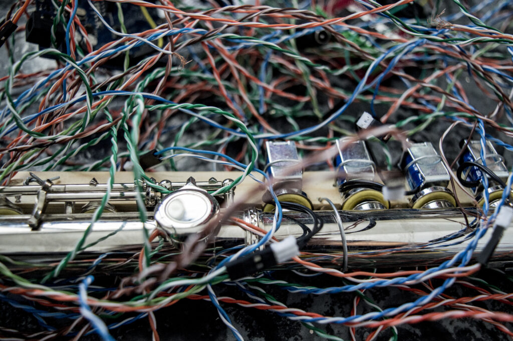 Au centre d’un grand prisme de tuyaux de PVC, une flûte traversière est entourée d’une multitude de moteurs, chacun affecté à une tâche précise : appuyer sur une clé, activer l’embouchure, gérer un mécanisme de poulie. Chaque moteur suit sa propre programmation, à son propre rythme, indifférent aux autres — comme autant de comités qui ignorent ce qui se passe dans la salle d’à côté. Le résultat est exactement ce que l’on pourrait attendre d’un tel système : un chaos sonore dans lequel la musique — la raison d’être de l’instrument — se perd dans le bruit de la machine.