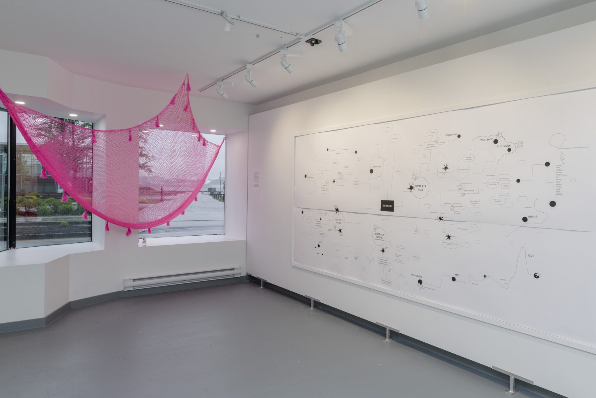 Dans Infralois et les architectures du commun, Jean-François Prost détourne une carte de l’immense territoire de la Ville de Lévis et déploie une installation en forme d’arc dans l’espace comportant une sélection de lois accessibles pour consultation au public. Des accents de couleurs et de textures dans les vitrines de la galerie inviteront les passants du secteur et le public à participer à la réalisation d’une dizaine d’interventions dans la Ville de Lévis.