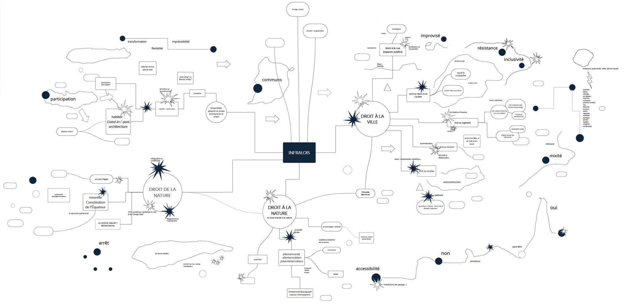 Par le biais du processus d’exploration des lois en relation avec l’imaginaire, le projet Infralois et les architectures du commun cherche à susciter une expérience et une connaissance plus complexes et nuancées d’un milieu de vie à postériori ouvert au dialogue, à la contestation ou à la reconfiguration des lois existantes.