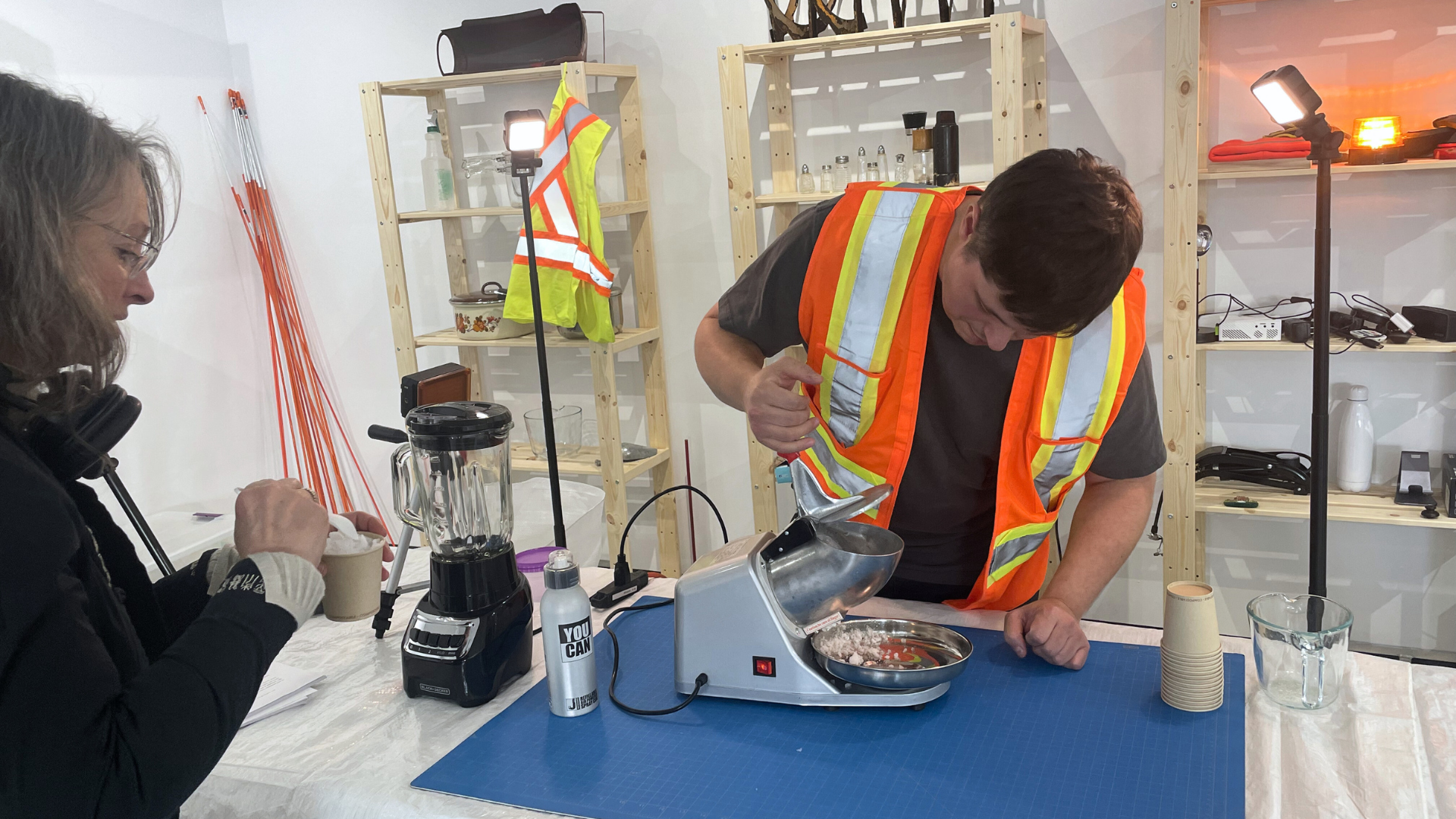 Guidés par l’artiste Maxime Sauvage, les élèves explorent librement l’exposition selon leurs intérêts, la température et leur élan créatif. Plusieurs activités sont proposées : dégustation de neige, dessin avec du sel, manipulation d’un “banc de neige”, lectures sur l’hiver, projections, improvisation poétique, expériences ludiques et fabrication d’une pâte de sel.